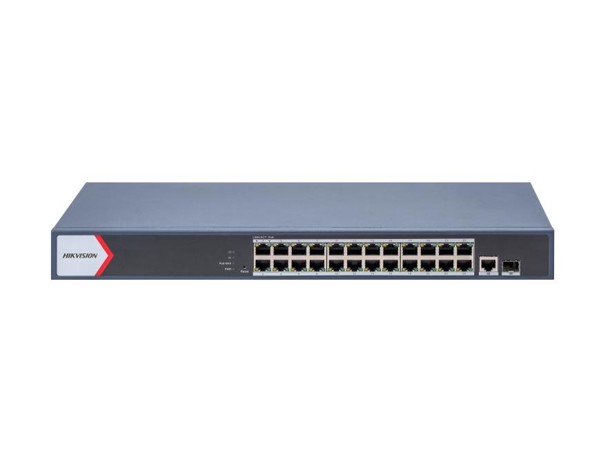 HikVision 24 Port Gigabit Smart POE Switch, 24 x Gigabit PoE port,1 x Gigabit RJ45 port, 1 x Gigabit fiber optical port, Power Budget 370W, Up to 300 m Long Range PoE Transmission, 6 kV Surge Protection