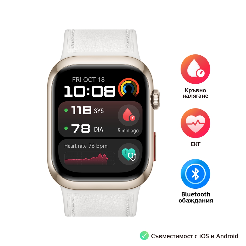 | Допълнителни функции | Microphone, Speaker, Micro pump, Rotating crown and Function button; Blood Pressure Measurement & ECG with built-in pump & inflatable strap; ECG certified |