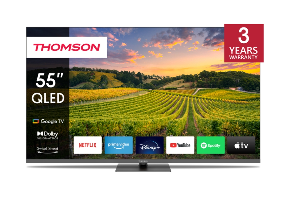 Thomson 55" QLED Google TV; 3840 x 2160 (4K UHD), 4000:1, QLED, 60 Hz, DVB-T/T2/C/S/S2, HDR10, Wi-Fi, Bluetooth, LAN, HDMI 2 (2.0) + 2 (2.1), USB 2 (2.0) + 1 (3.0),Central Swivel Stand, Dark gray